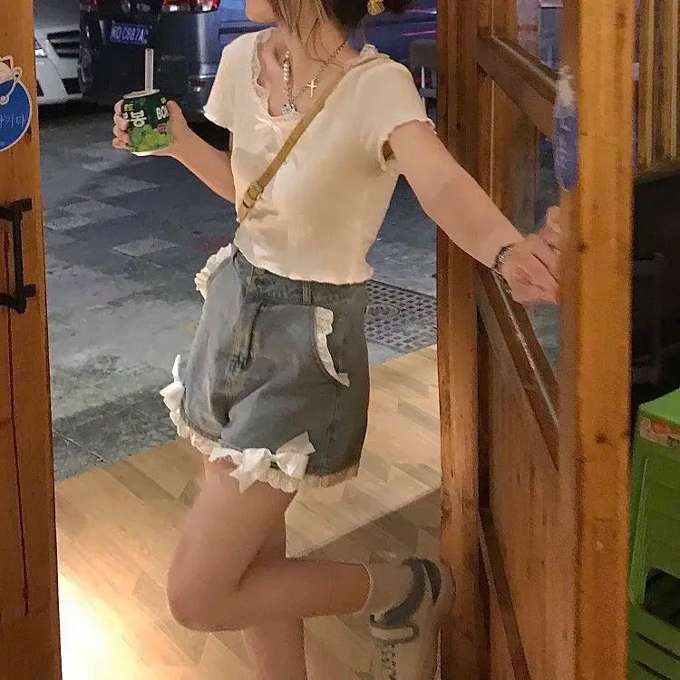 Japanese Preppy Style Bow Lace Patchwork Y2k Shorts Women Summer Straight Hotsweet High Waist Denim Short Pants Ruched