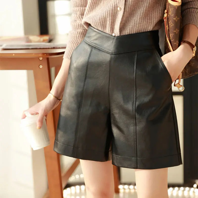 Simplicity Fashion Autumn New Women Solid Zipper Pocket Patchwork Korean Chic High Waist Loose A-line PU Leather Wide Leg Shorts