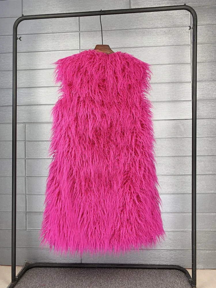 Winer Women Warm Faux Fur Plush Coats Mongolia Sheep Fur Women Long Vest Female Jacket Autumn Furry Sleeveless Outerwear 2024