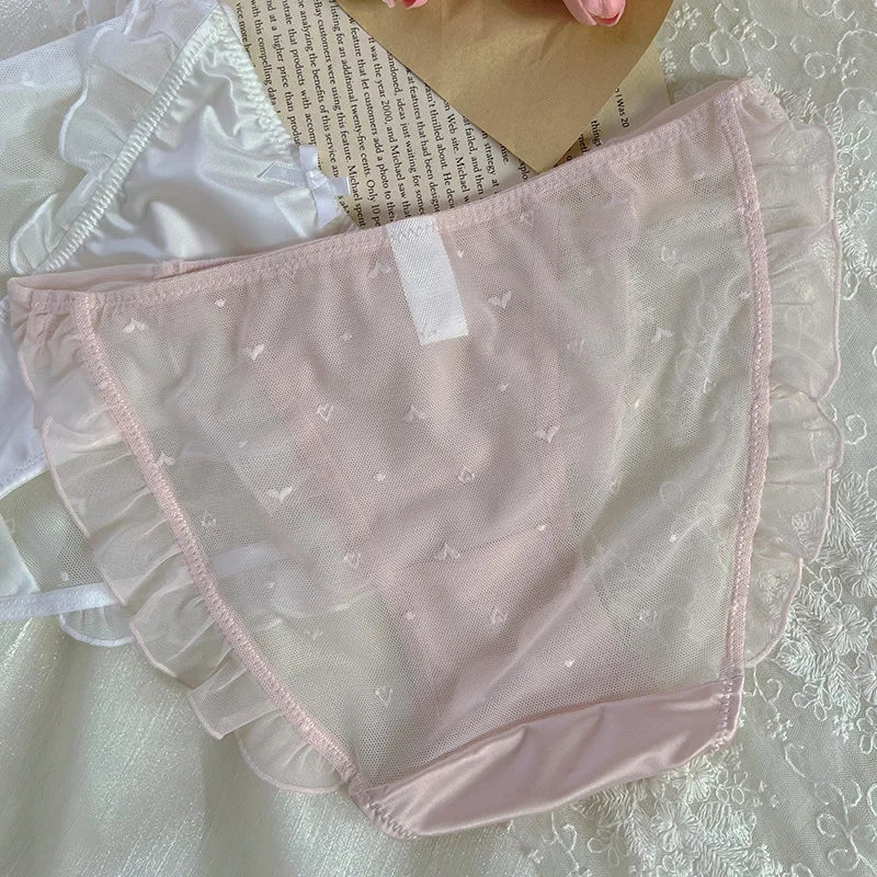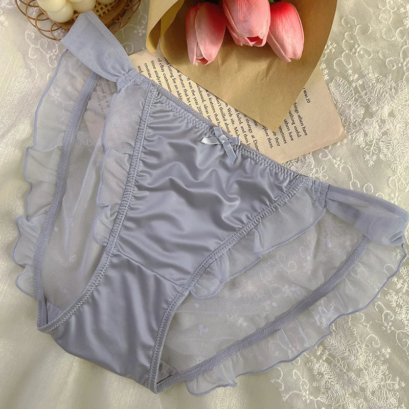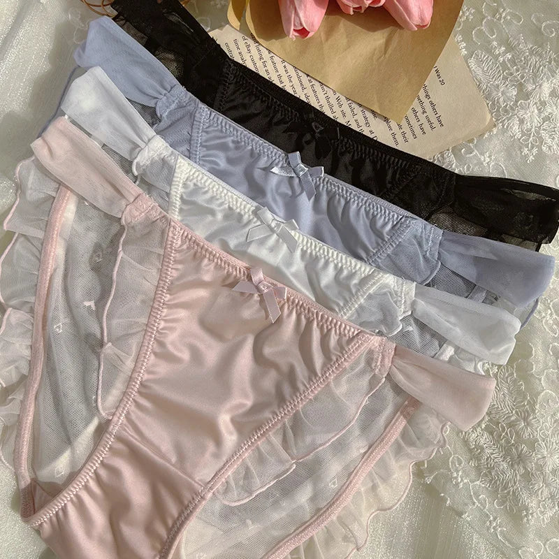 Women Sexy Mesh Satin Lace Ruffles Underwear Transparent Bow Cute Lovely Low Waist Thin Breathable Panties High Forks Breifs